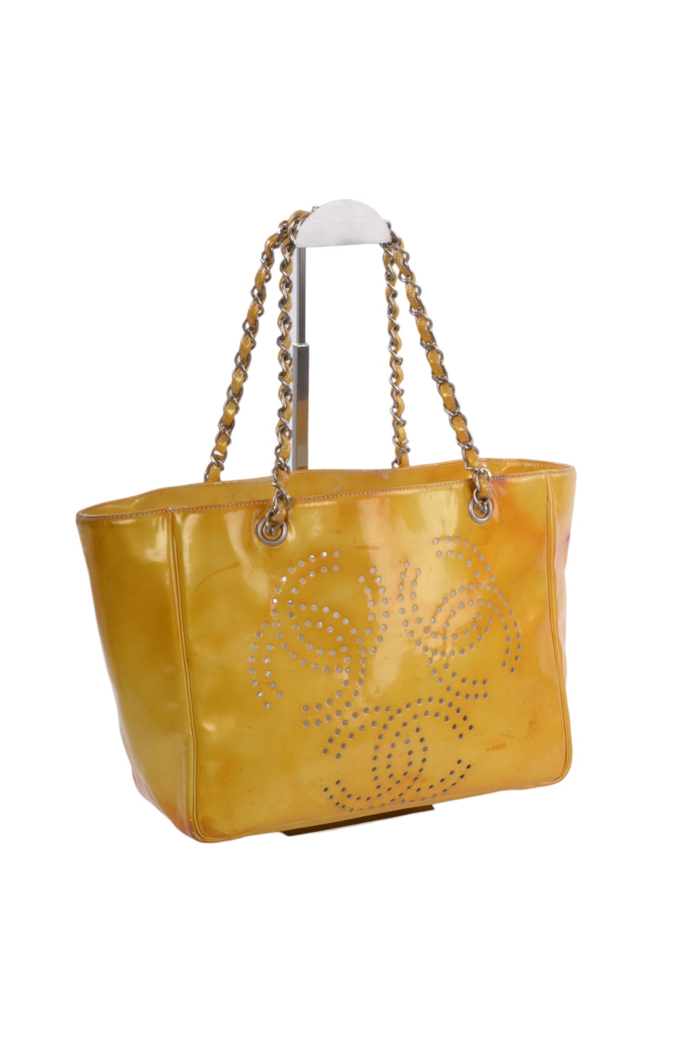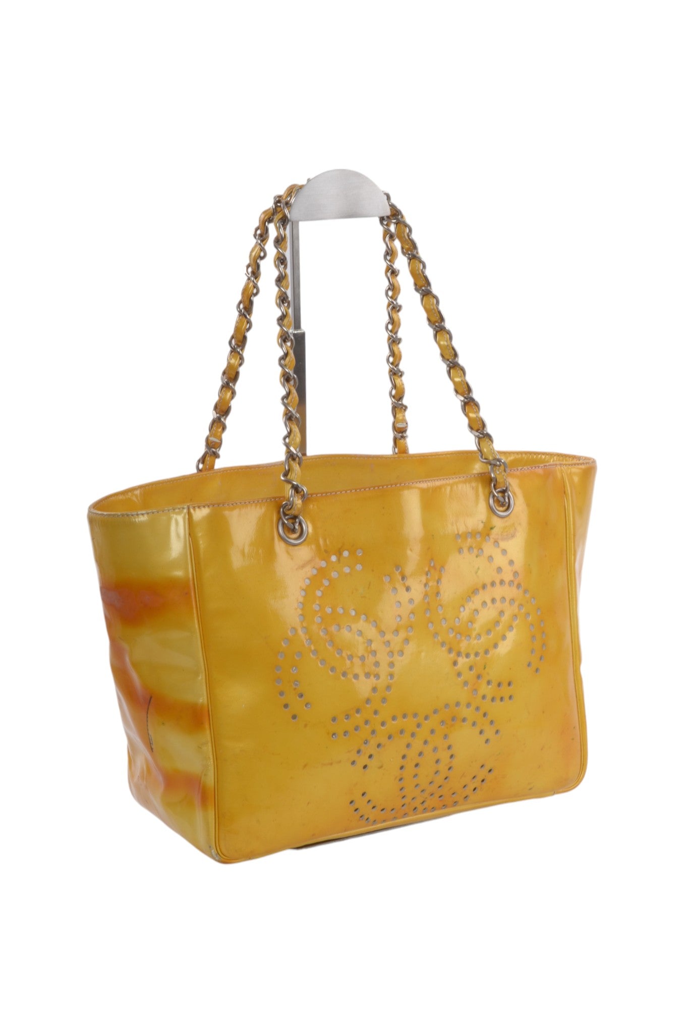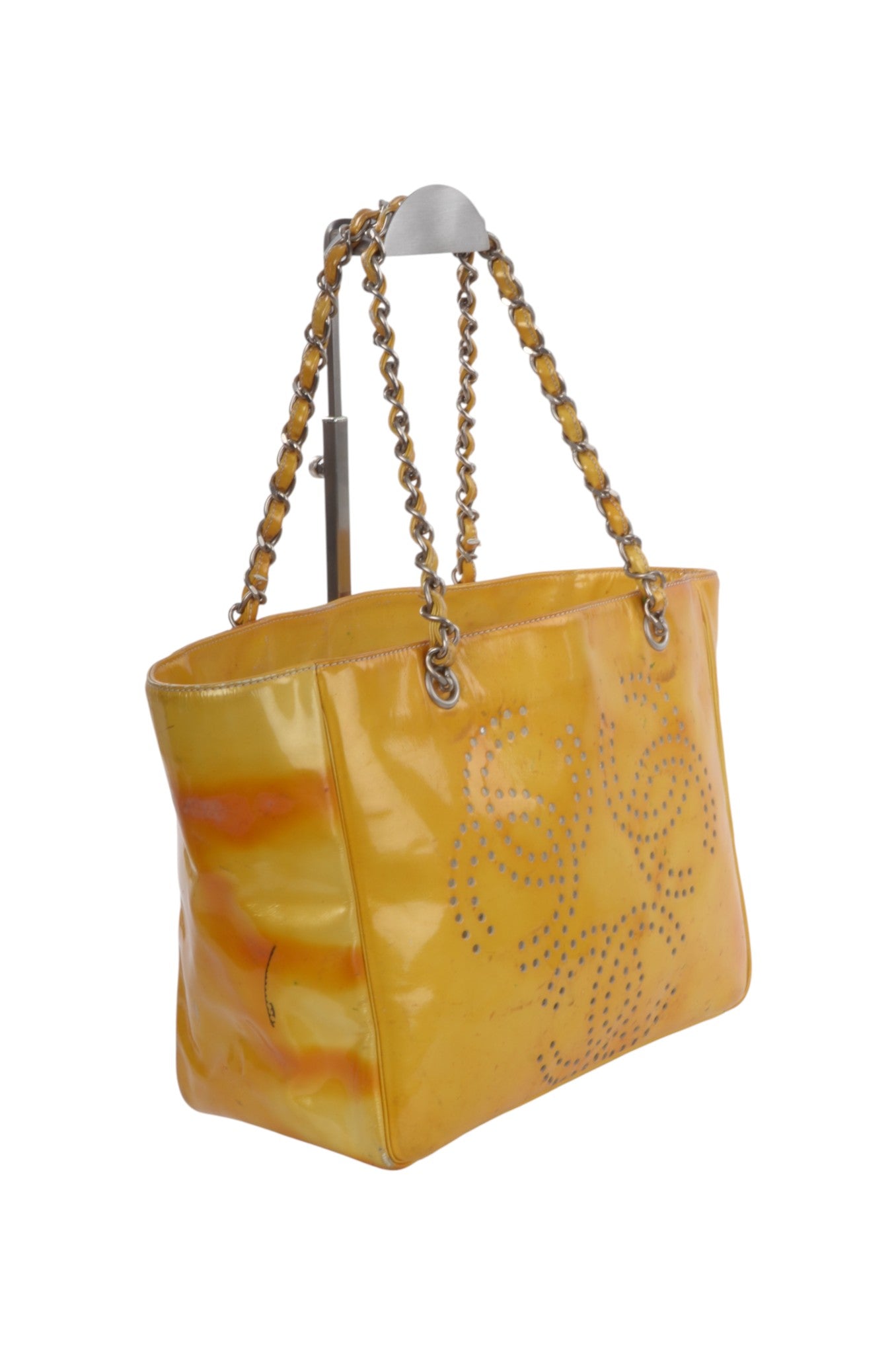 Chanel CC Logo Chain Shoulder Bag Patent Leather Tote Handbag Vintage Orange Designer Classic Authentic