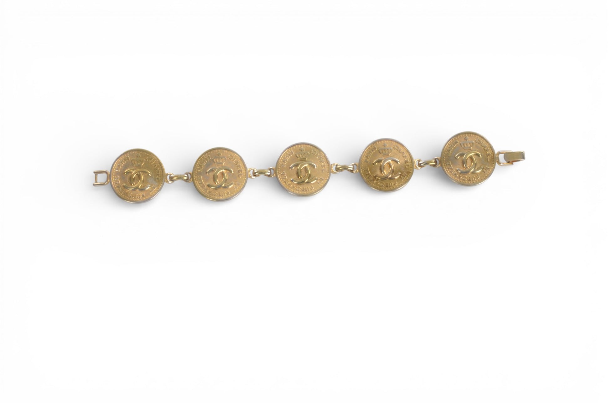 Chanel CC Logo Coin Medallion Crown Bracelet Vintage Gold Statement Designer Classic Jewelry