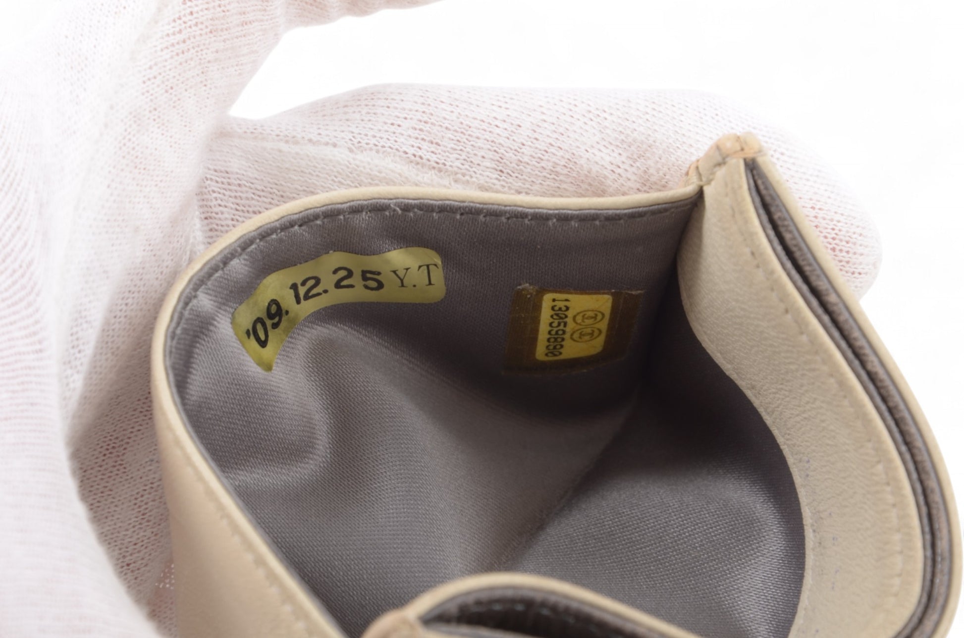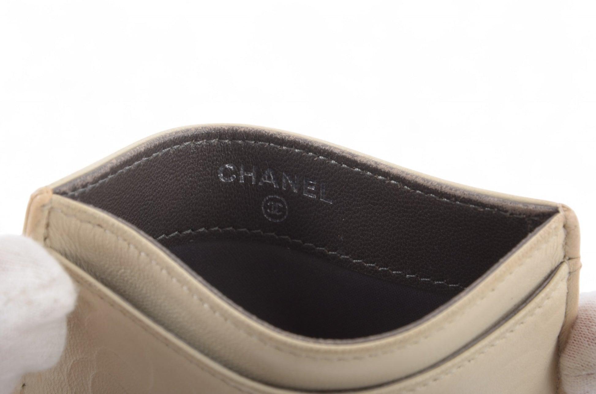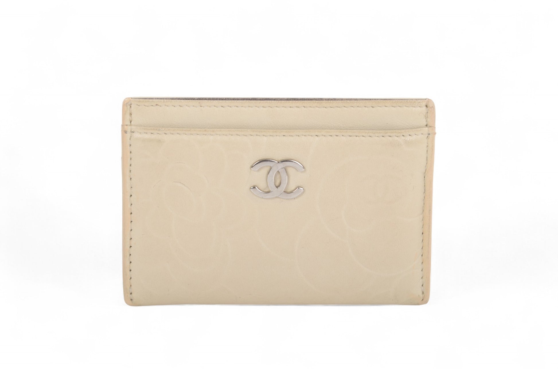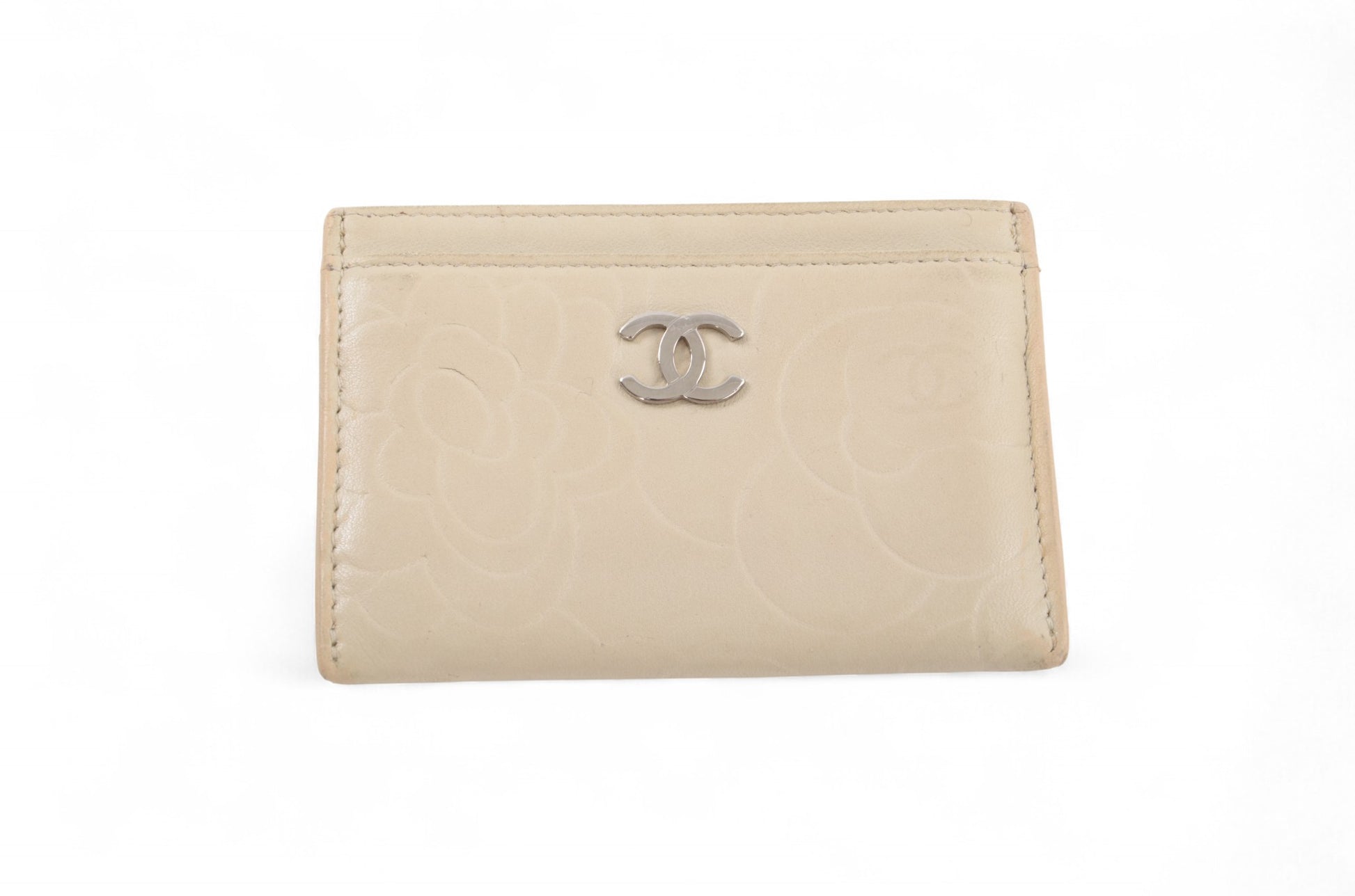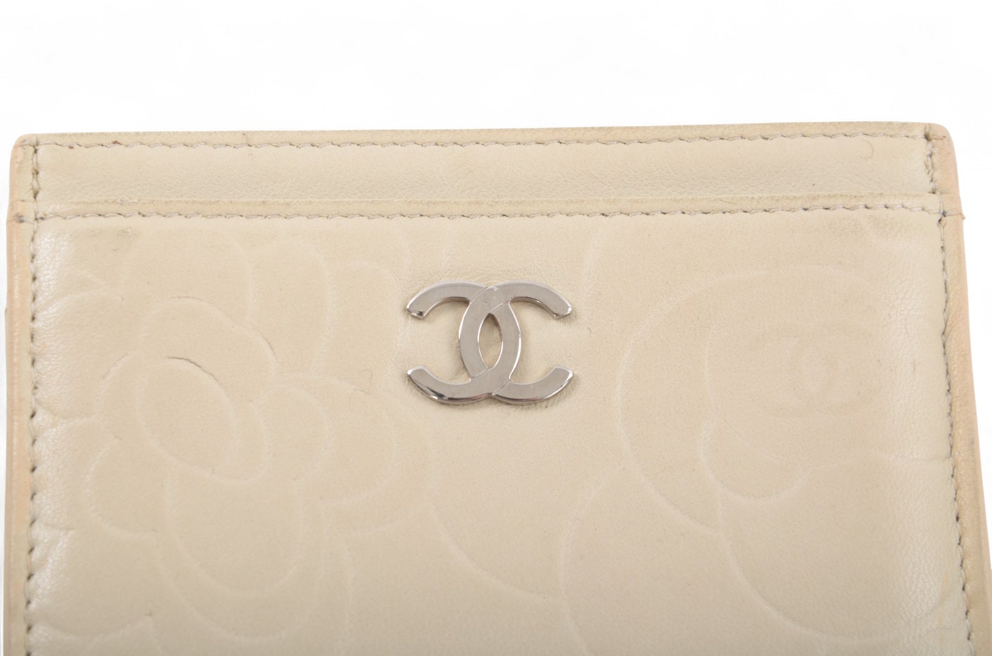 Chanel Coco Camellia Lambskin Leather Cream Card Case Wallet Holder Cardholder Vintage Designer Classic Authentic Beige Silver