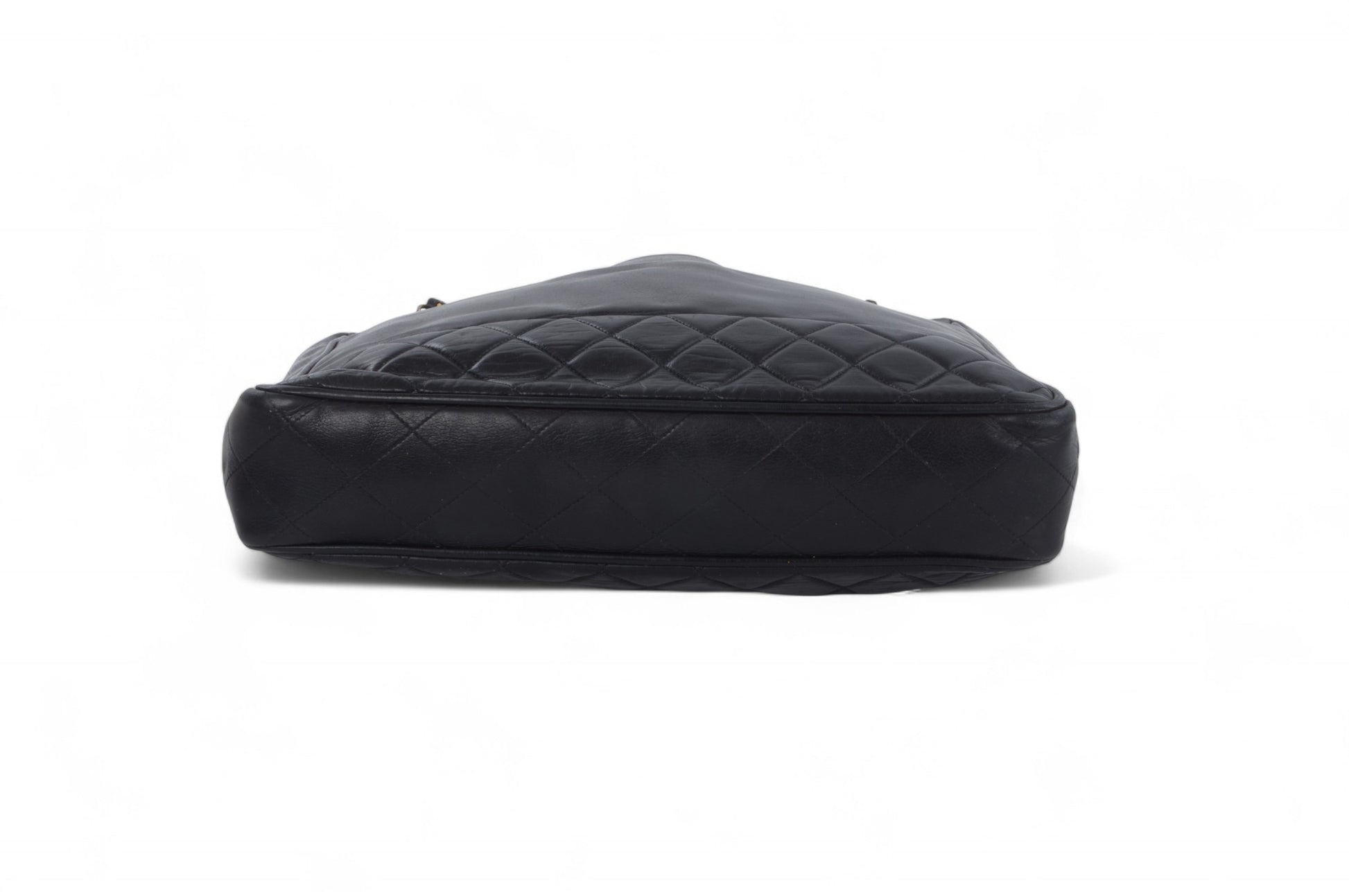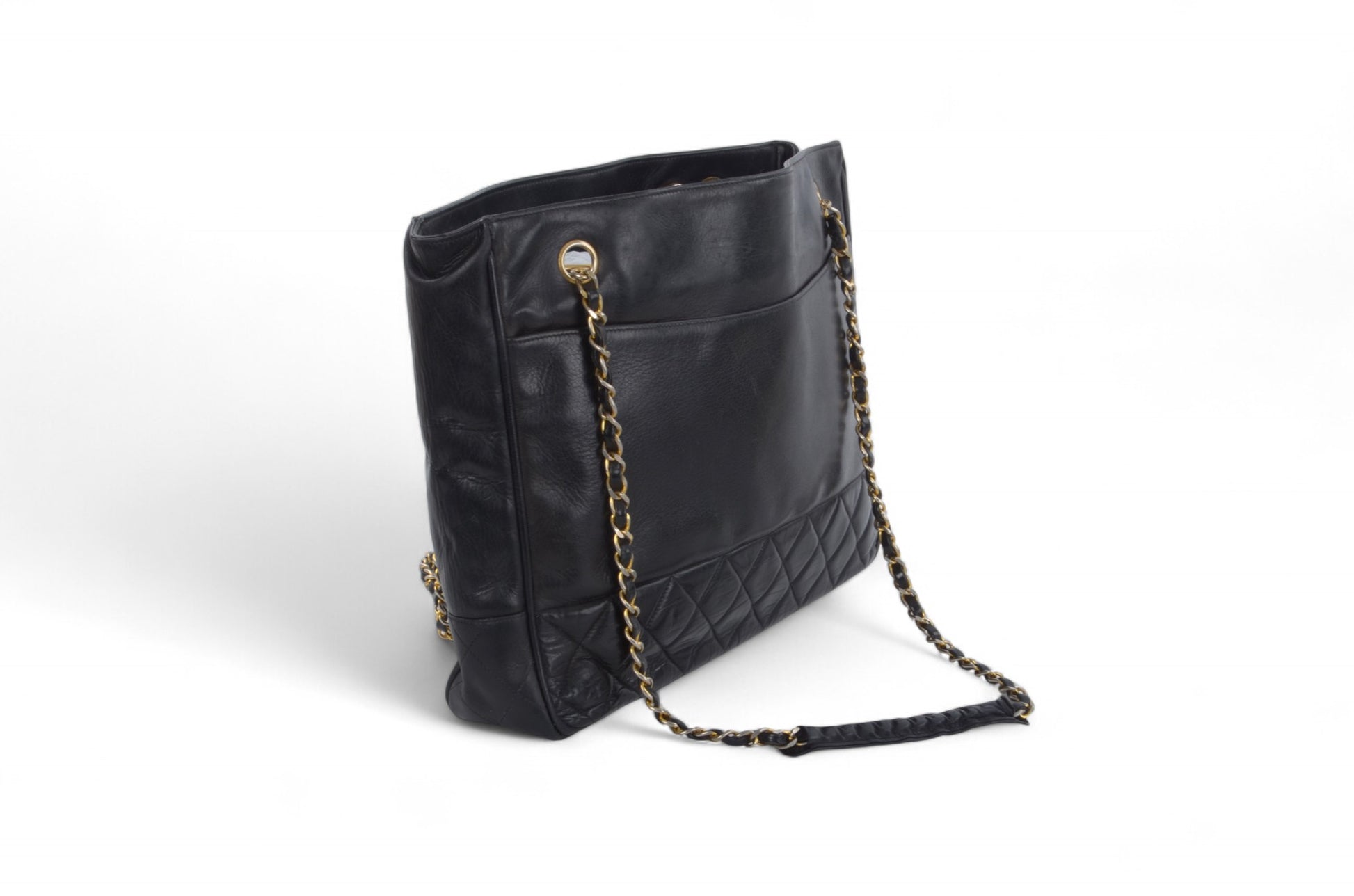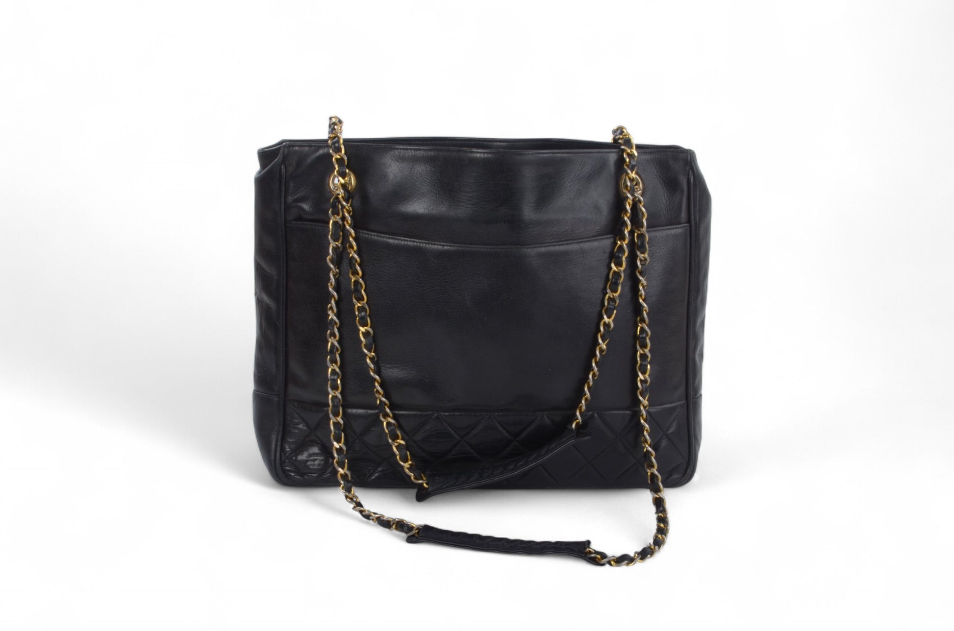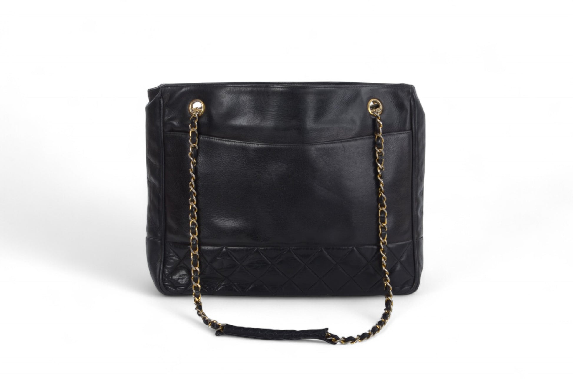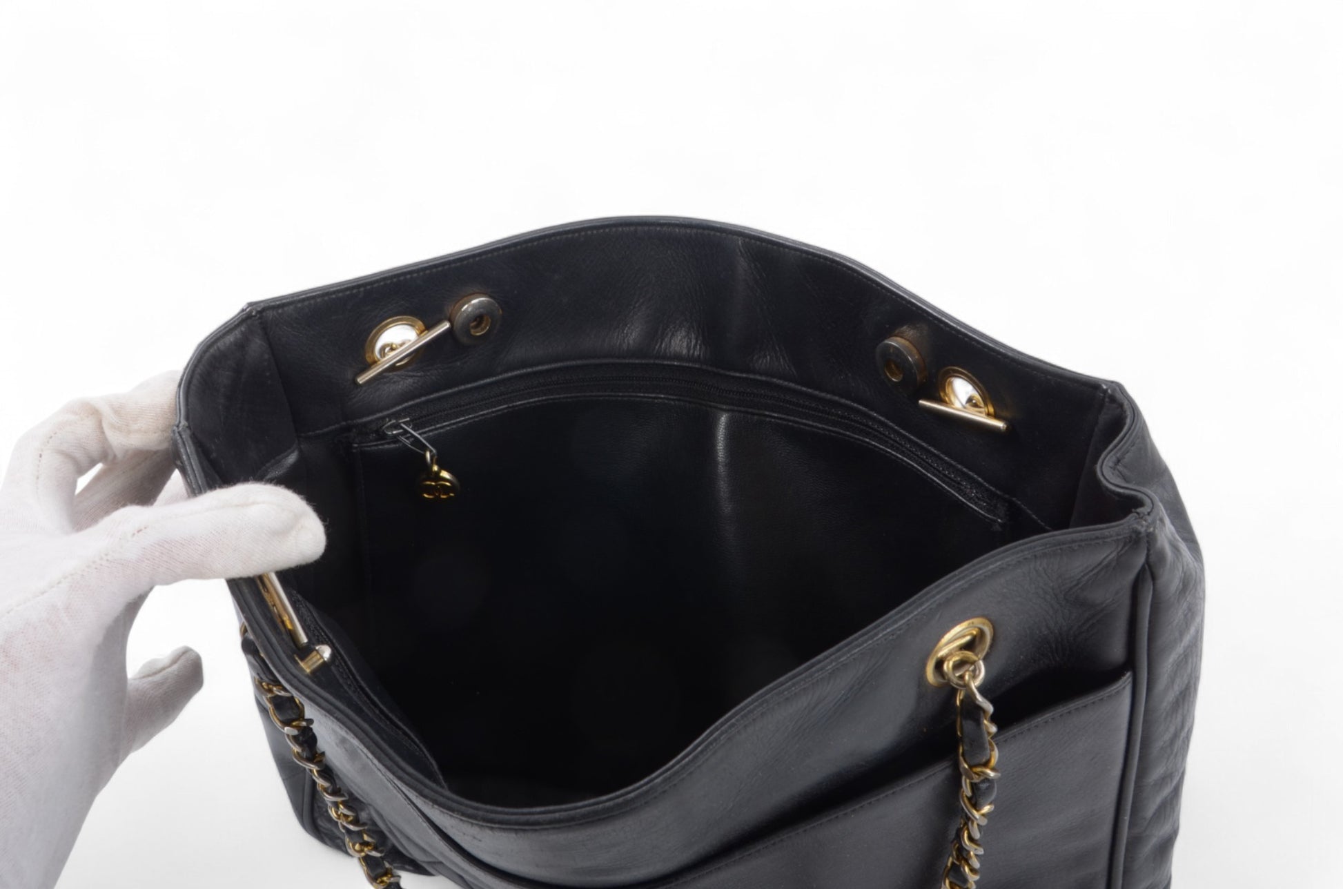 Chanel Matelasse Quilted Lambskin Chain Tote Handbag Leather Black Shoulder Gold Vintage Designer Classic Authentic