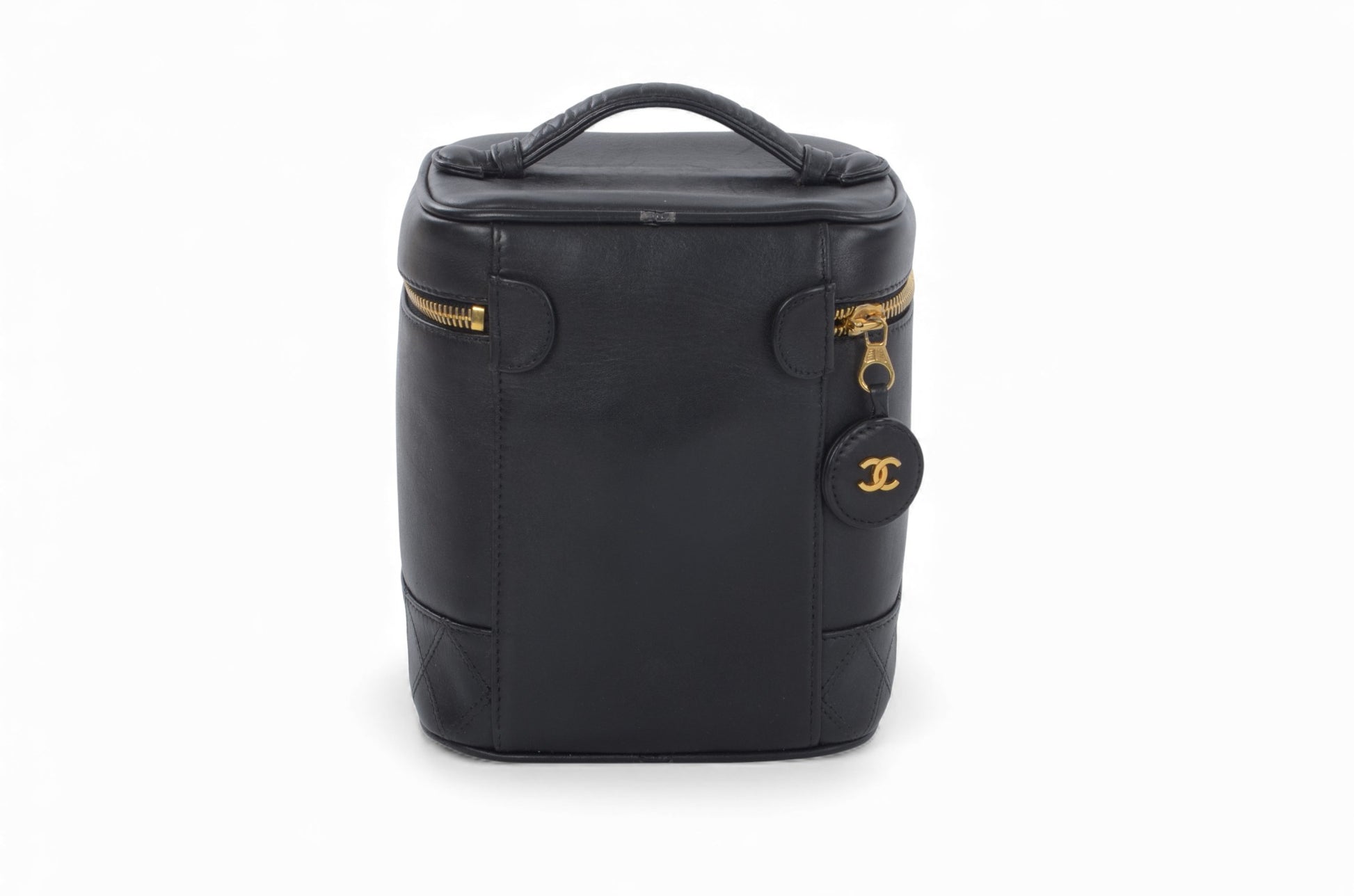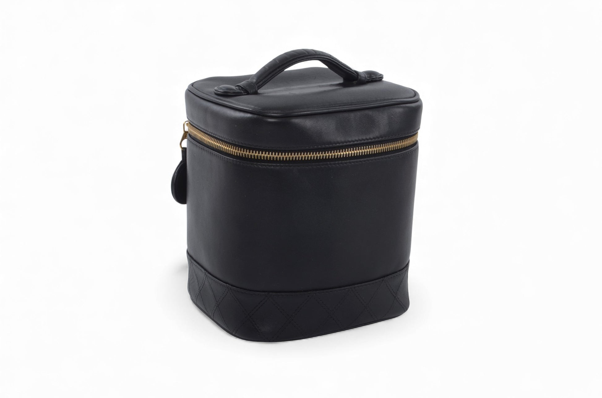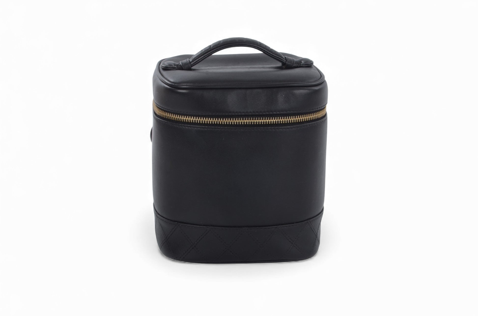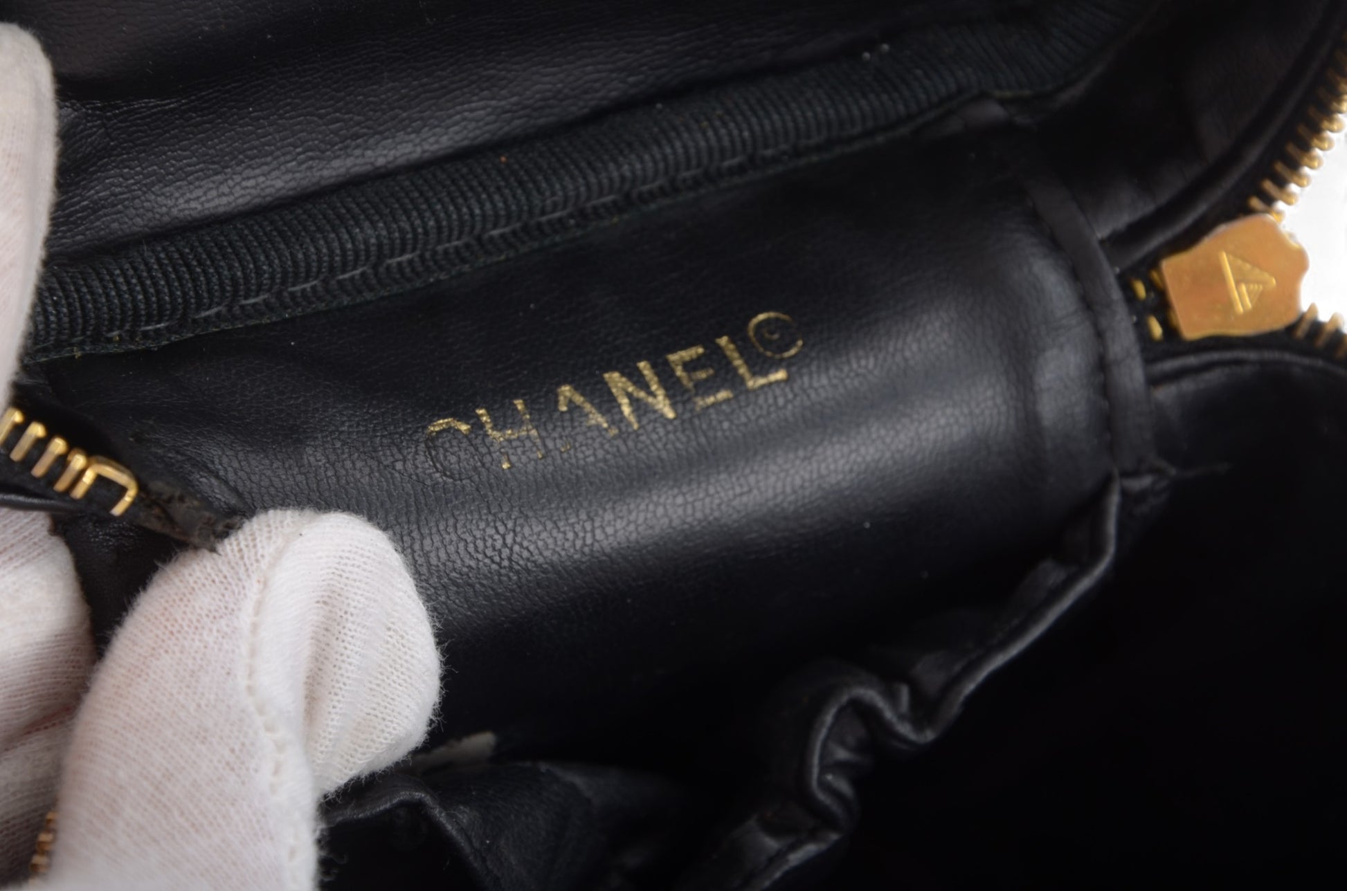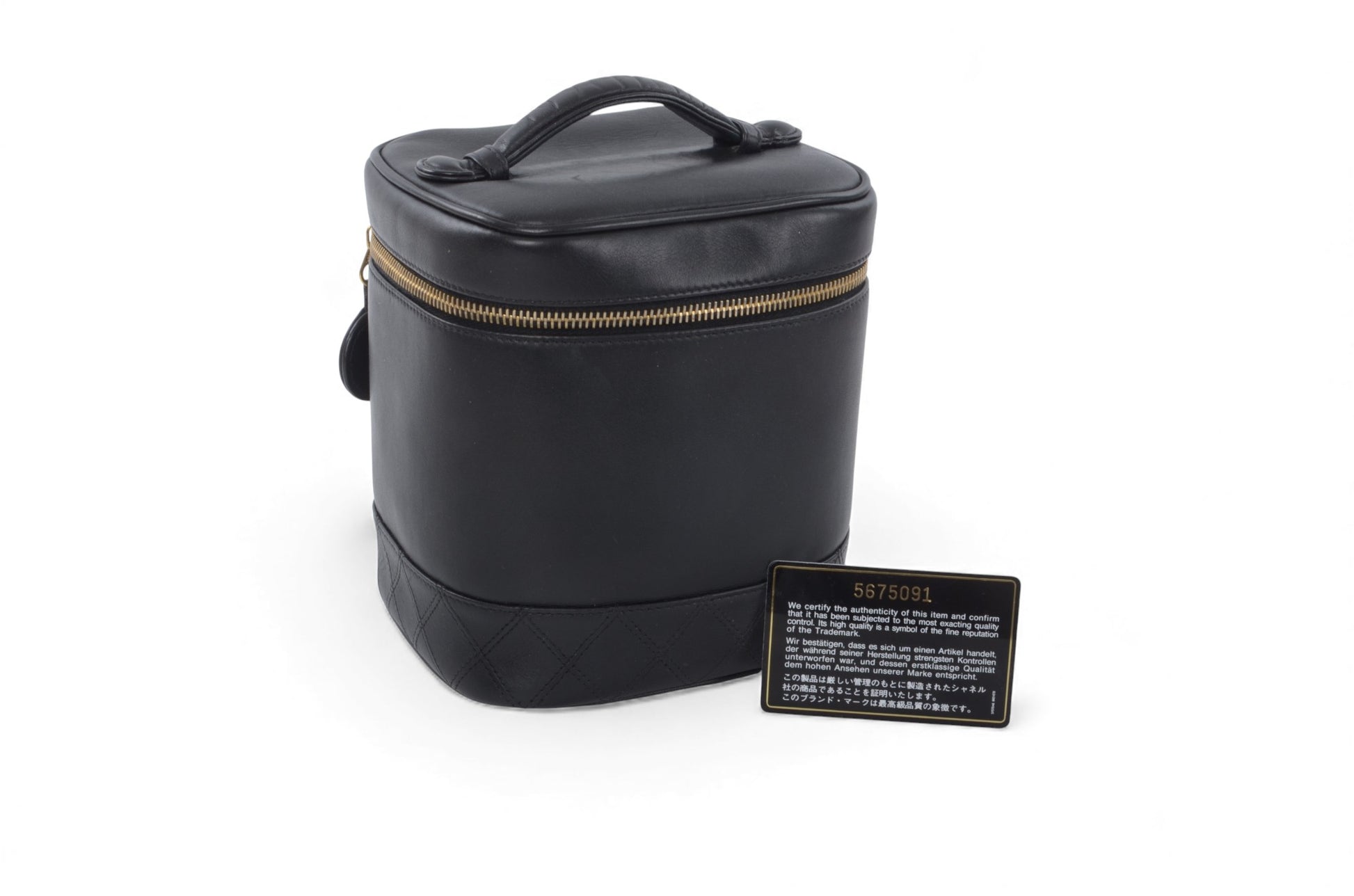 Chanel Quilted Vanity Toiletry Bag CC Logo Vintage Lambskin Leather Black Make Up Pouch