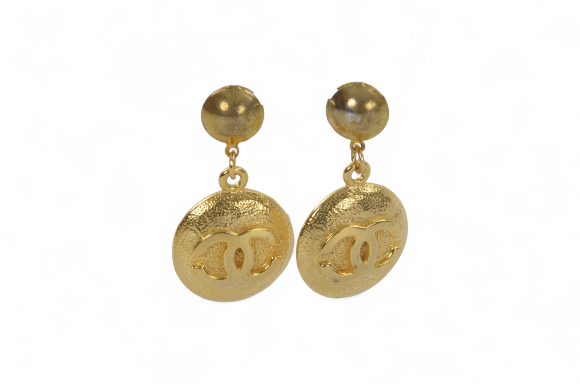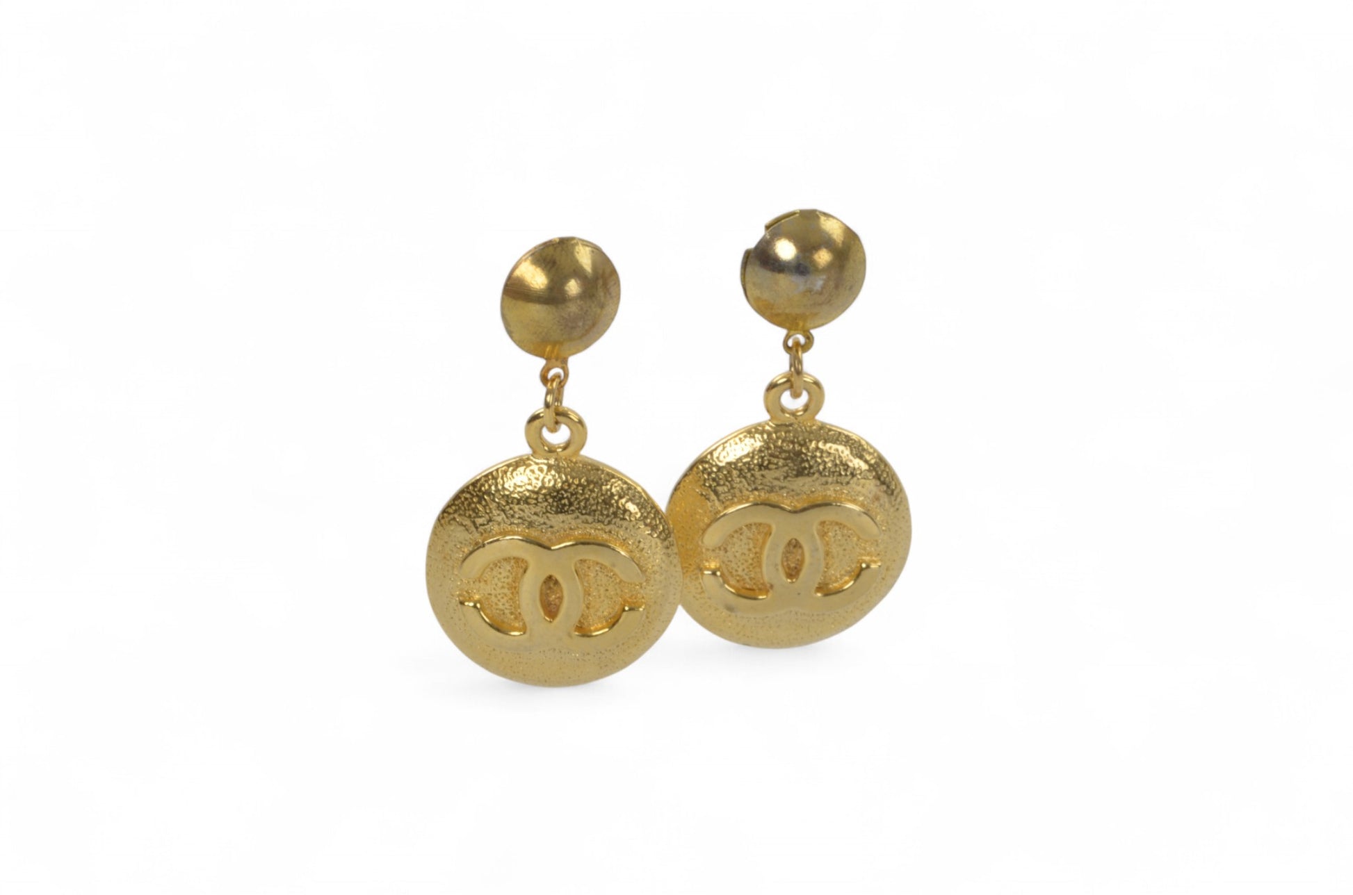 Chanel Vintage CC Coco Dangle Drop Button Earrings Gold Plated Statement Designer Classic Jewelry