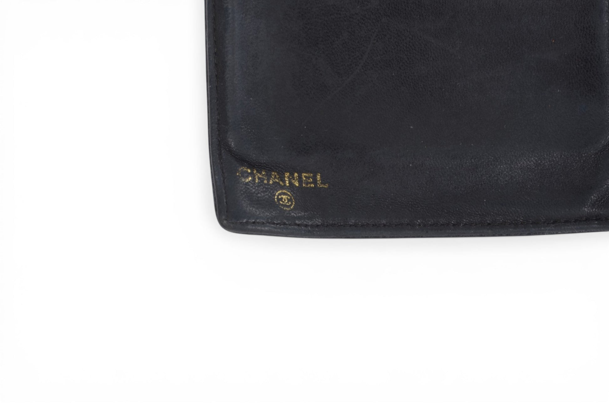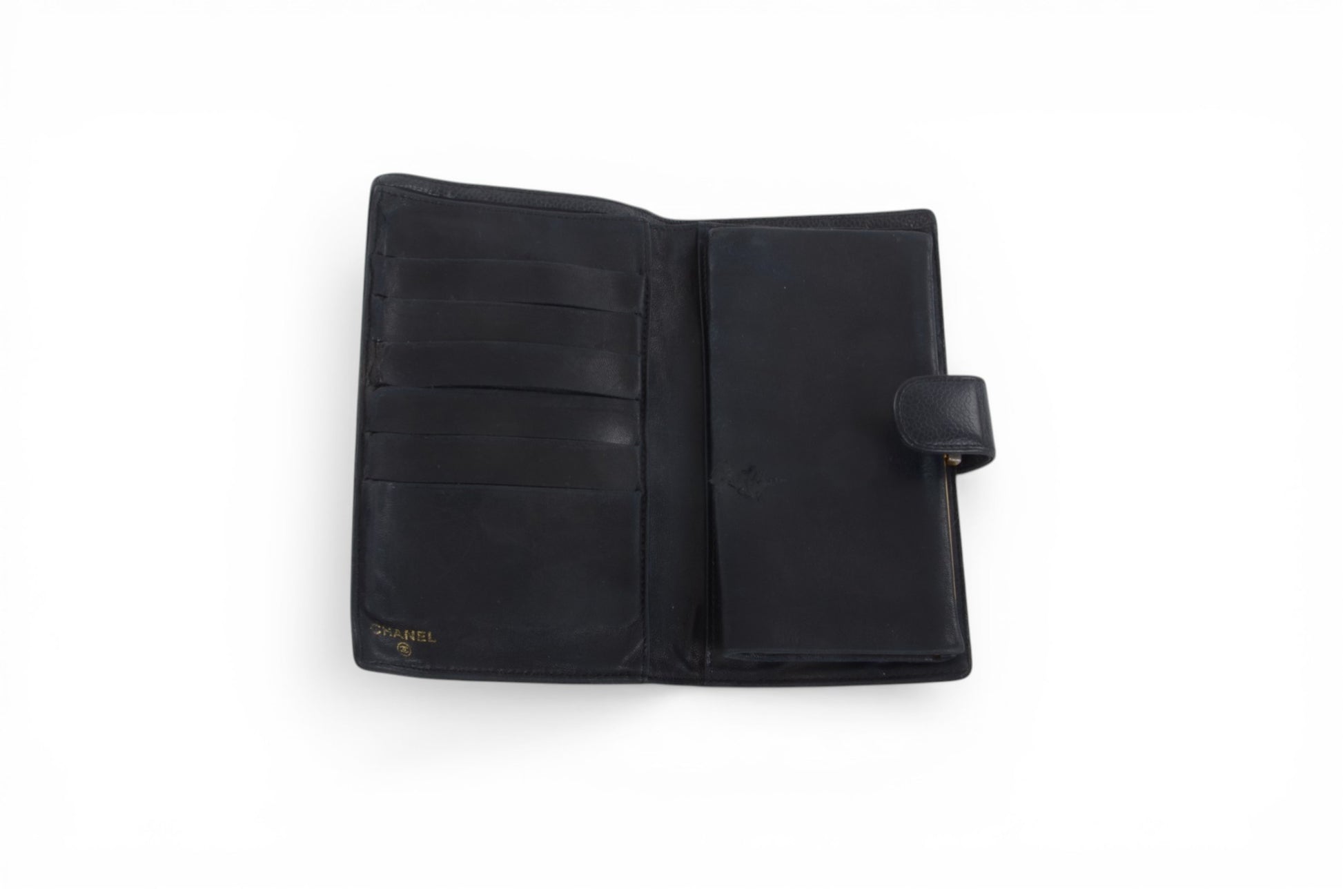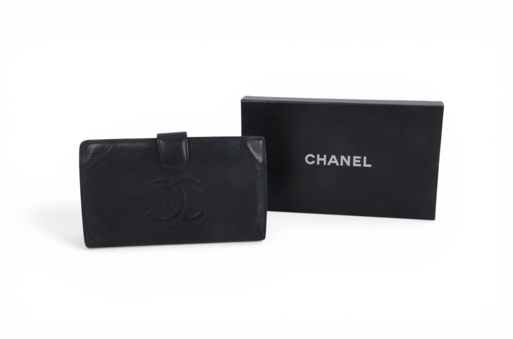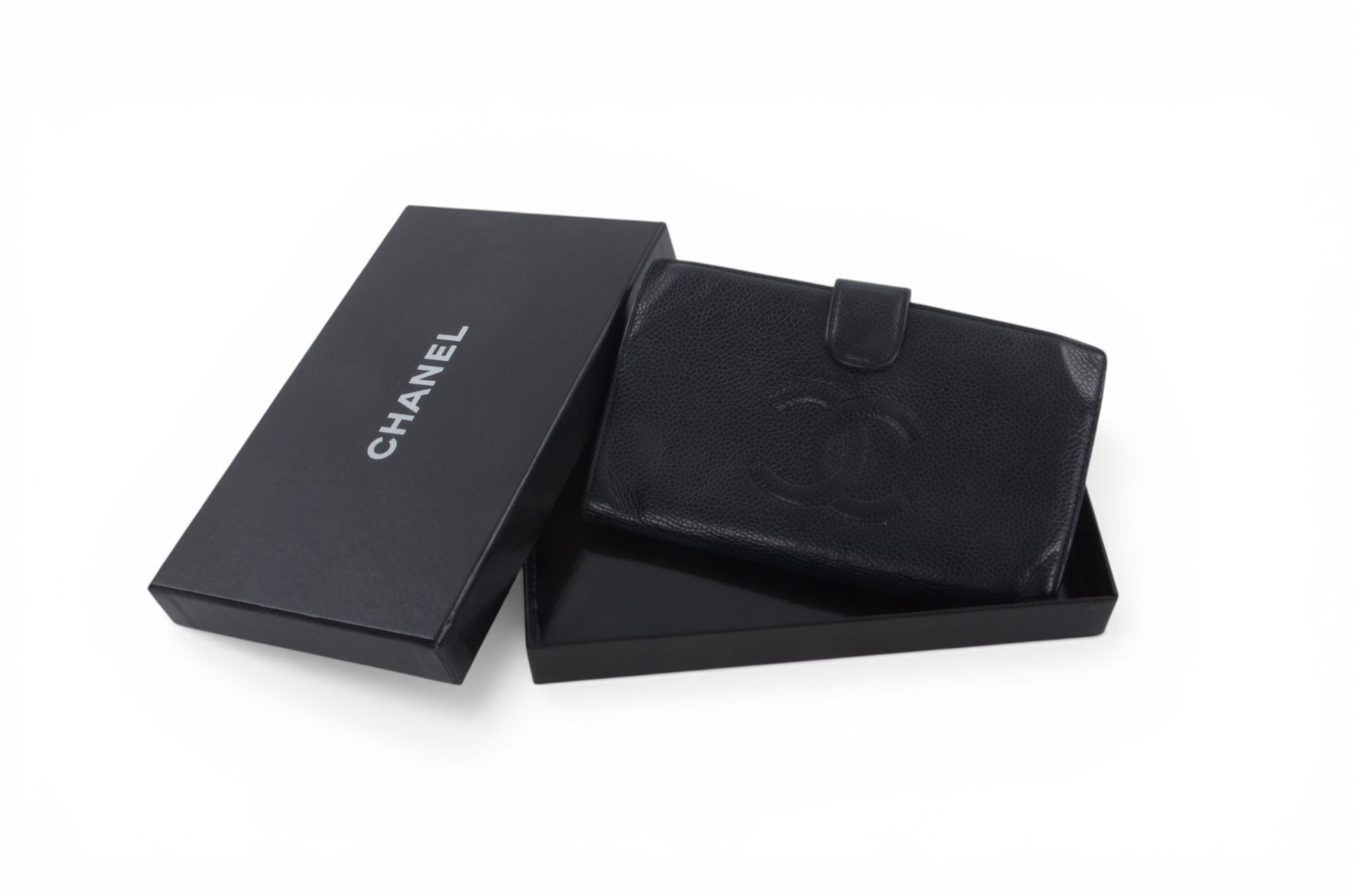 Vintage Chanel black Caviar leather bi-fold wallet with iconic Coco logo, an authentic designer cardholder and classic luxury accessory perfect for everyday use or collecting.