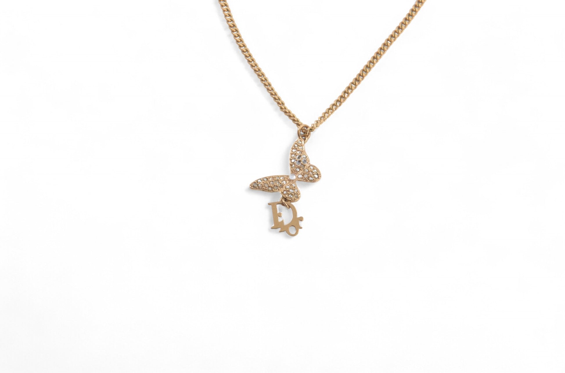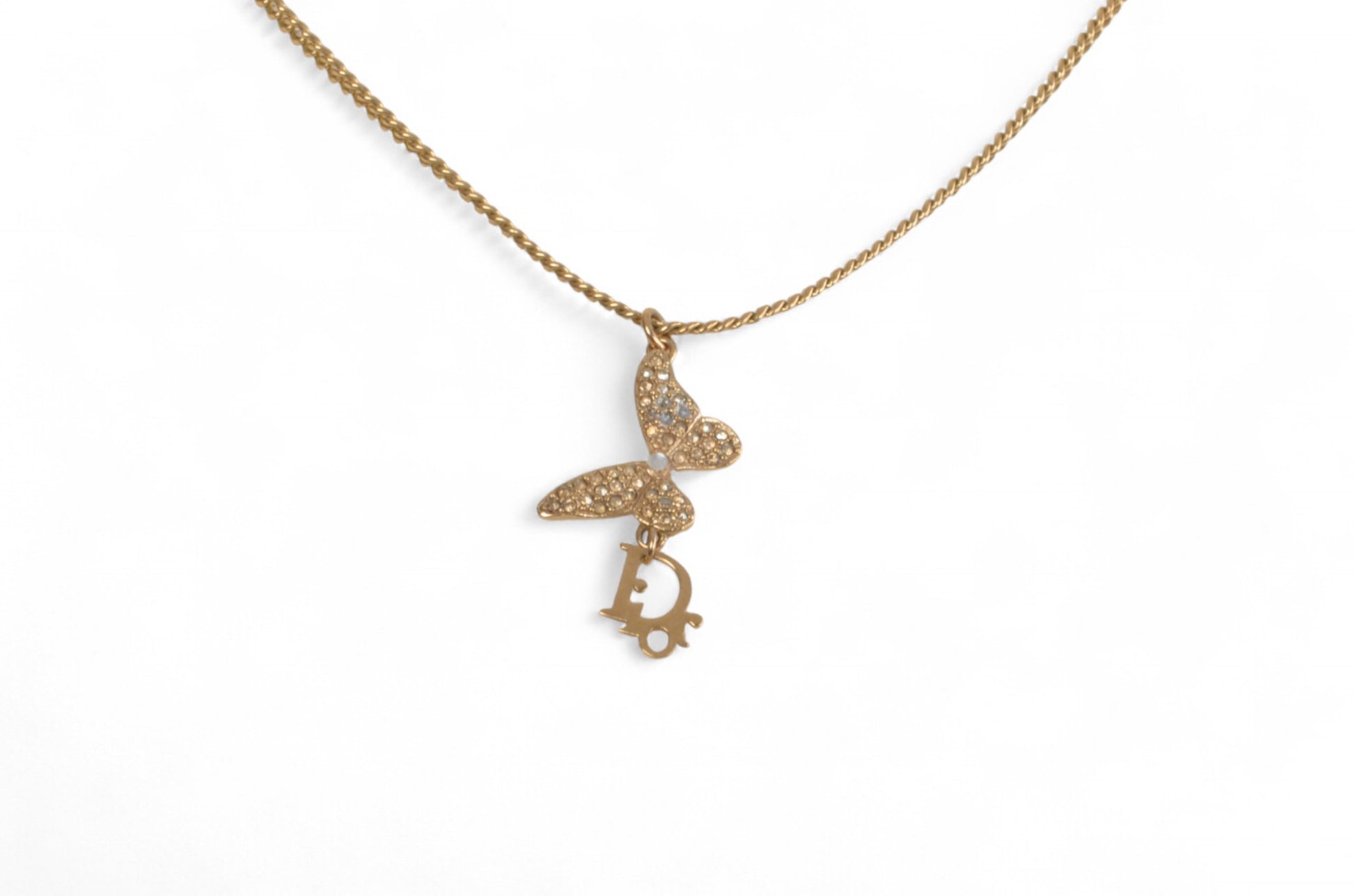 Christian Dior Crystal Oblique Butterfly Pendant Necklace Vintage Logo Gold Plated Designer Classic Jewelry Authentic