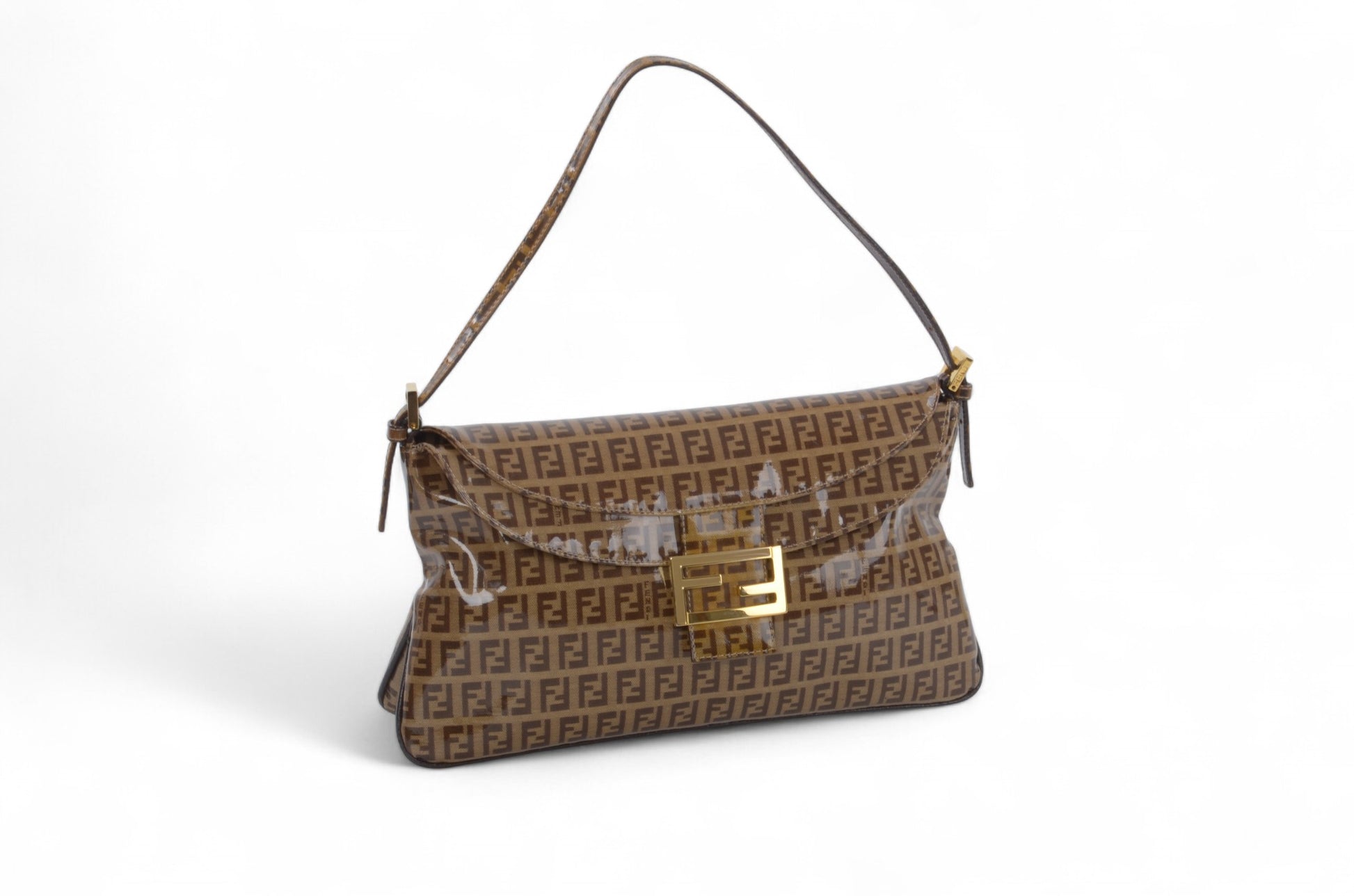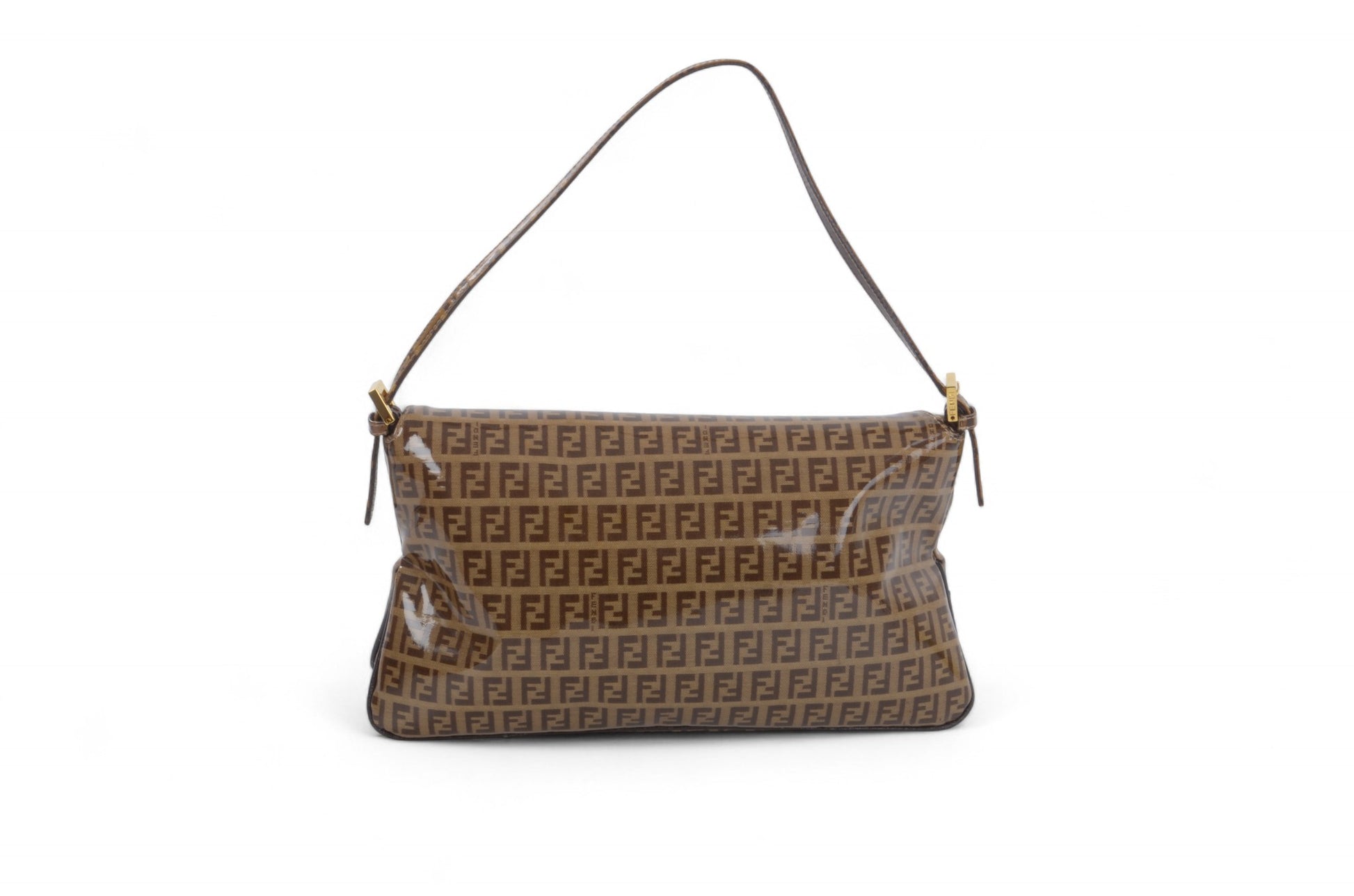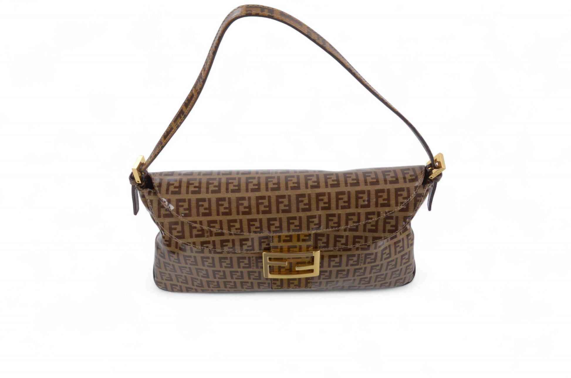 Fendi Baguette Crystal Double Flap 90s Zucca Zucchino Shoulder Bag Handbag Patent Leather Vintage Brown Designer Classic Rare Authentic