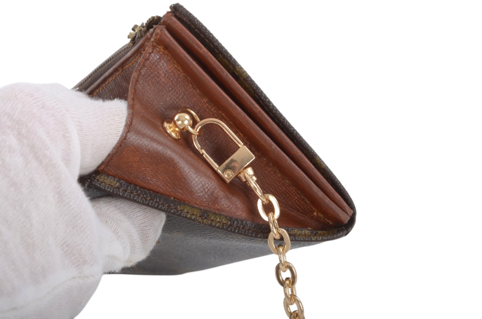 The wallet comes with a crossbody chain included so that the wallet can be used as a bag. The chain and fasteners is not from Louis Vuitton.