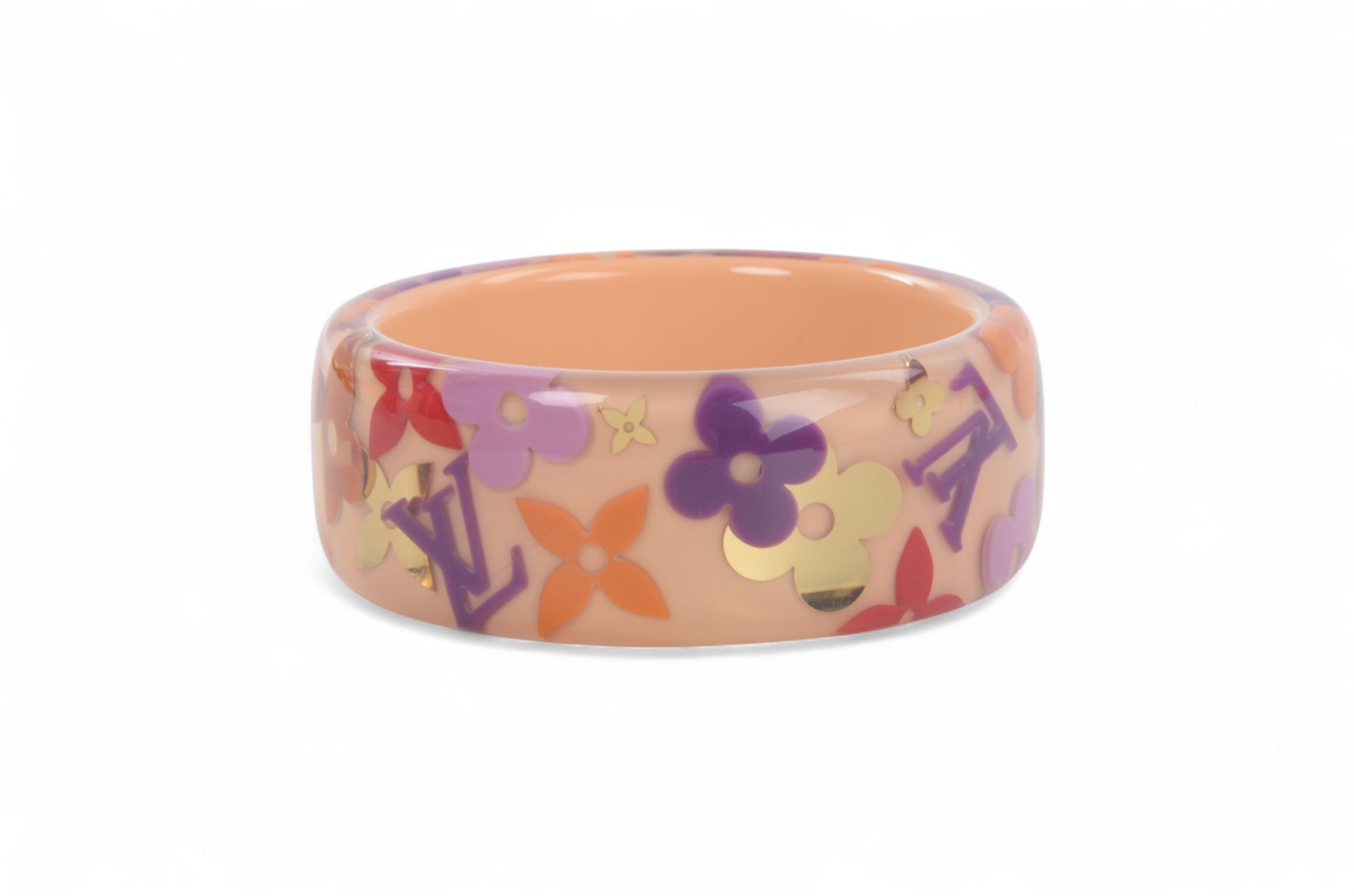 This stylish bracelet in pink resin features floating gold Louis Vuitton monogram emblem inclusions. This is a chic, one of a kind bracelet, with the luxury and style of Louis Vuitton!